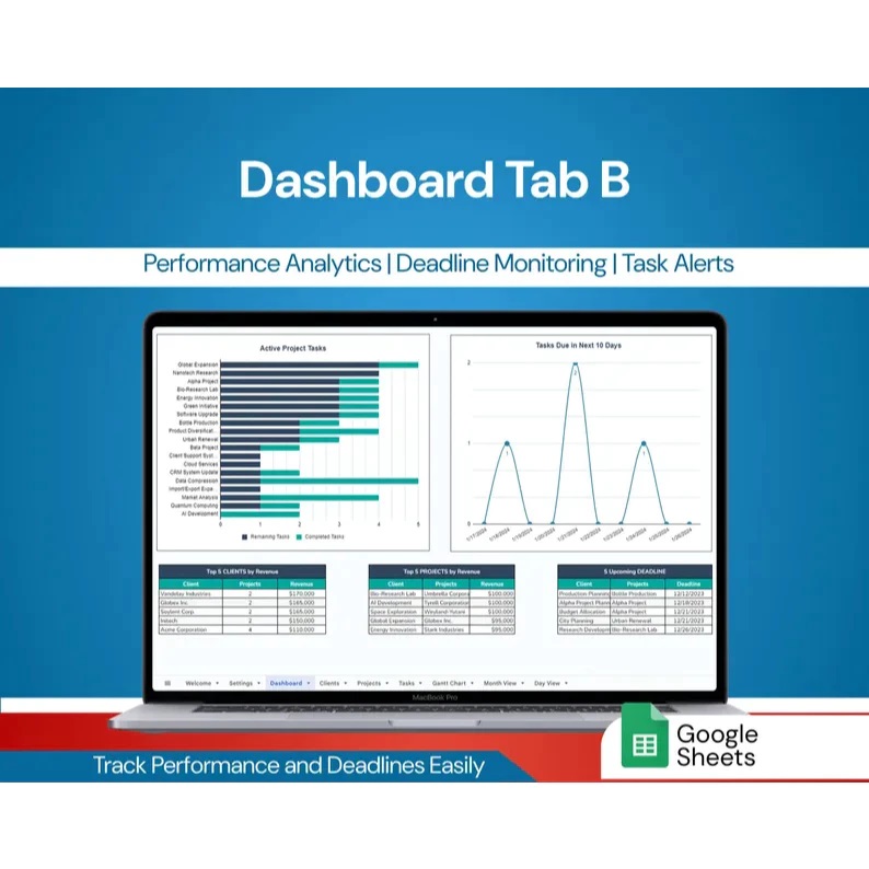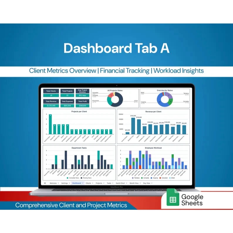 - Analyze project performance and client profitability with interactive charts.
