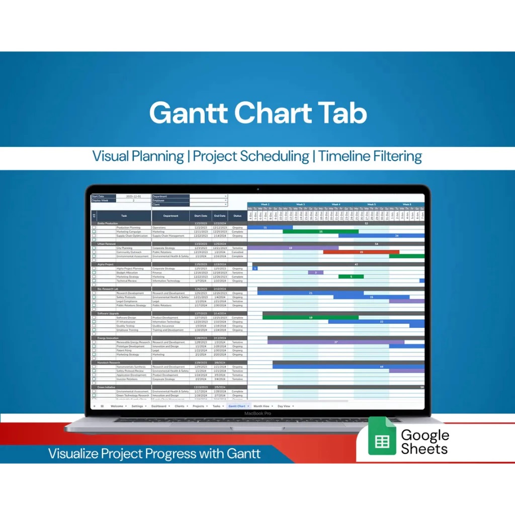 - Visualize project timelines with color-coded bars for easy monitoring.