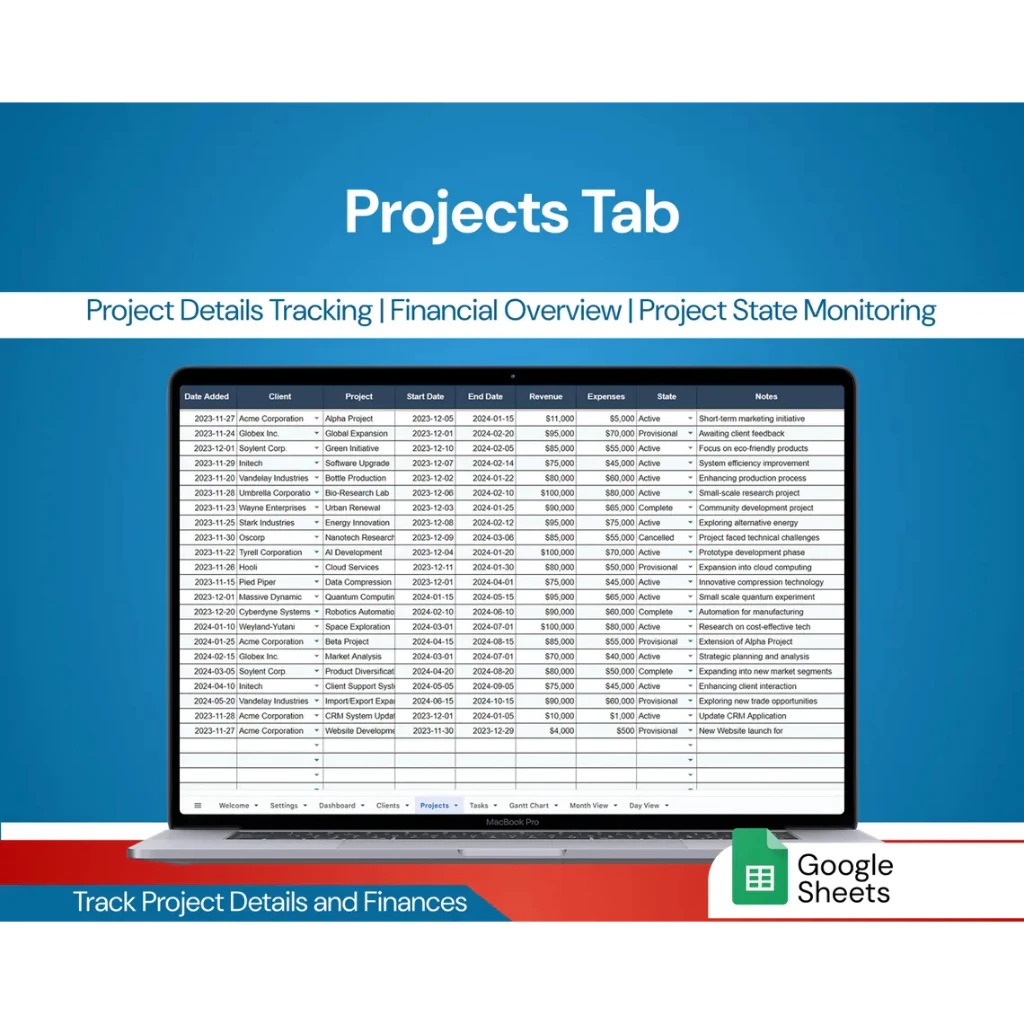 - Track project progress with status indicators such as Active, Completed, or Canceled.